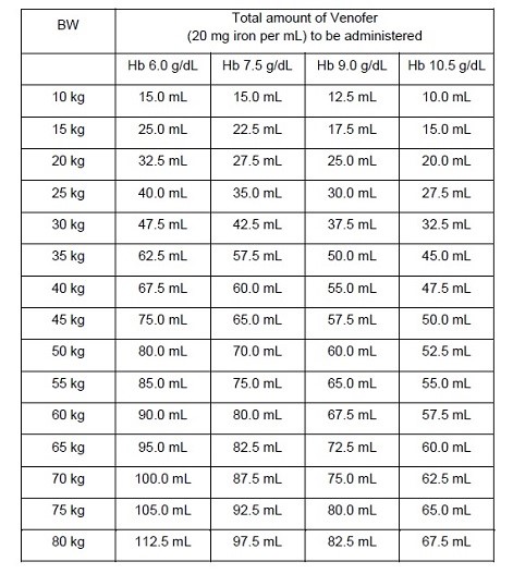 The cumulative dose of Venofer must be calculated for each patient individually and must not be exceeded. The dose is calculated on the basis of body weight and Hb value.